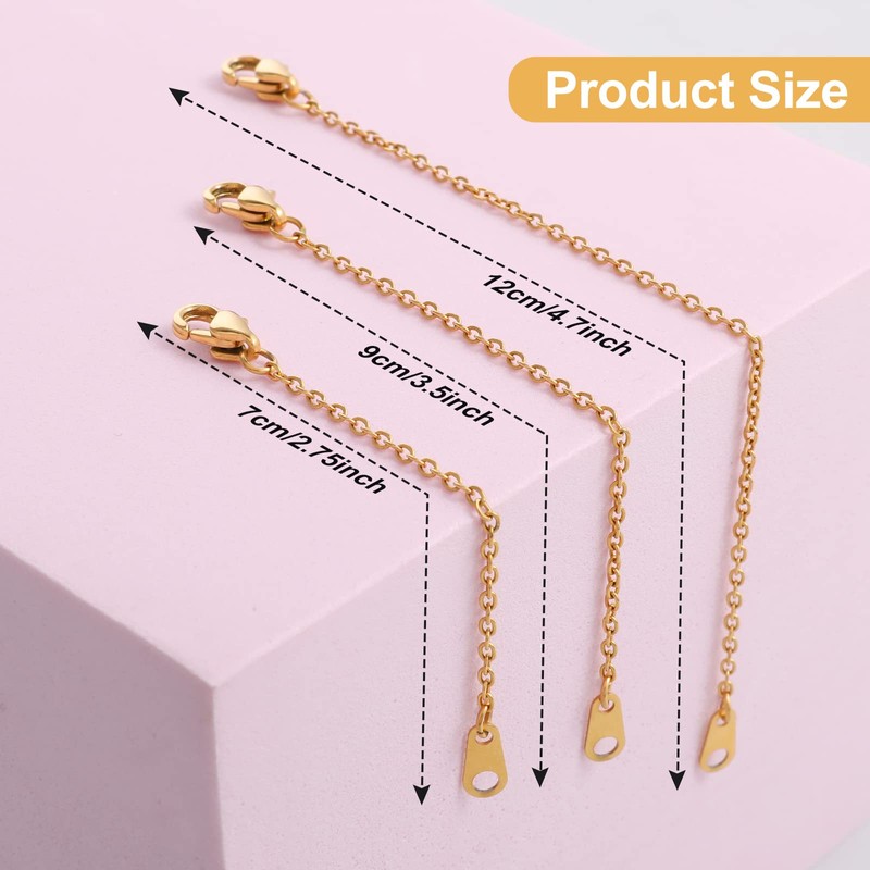 - VARIOUS SIZES:Package includes 3 stainless steel necklace extenders (2,3,4 inches, one for each size).Gold chain extenders for necklaces make it easy to add length to your jewelry. Multiple sizes to meet your different needs for necklaces, bracelets and anklets