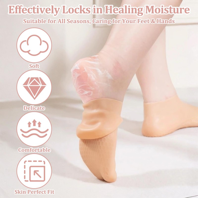 - Package Contents: The set includes 2 pairs of silicone foot socks and 3 pairs of hand care gloves, available in beige and pink. Silicone gloves for dry hands is both practical and beautiful, suitable for people with dry feet and dehydrated feet caused by frequent wearing of shoes. Silicone socks for women can easily cope with daily care needs and help you easily say goodbye to calluses and dry cracks.