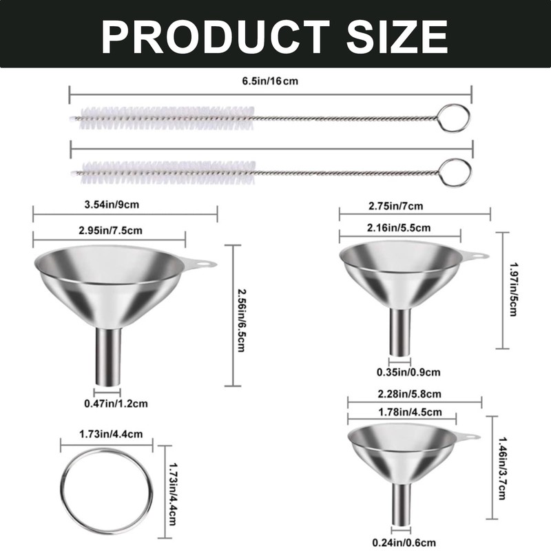 - Three Sizes for Various Needs: The set includes three different sizes of funnels (large diameter 7.5 cm, medium diameter 5.5 cm, and small diameter 4.5 cm). It also comes with two cleaning brushes, making it easy to clean funnels of different sizes.