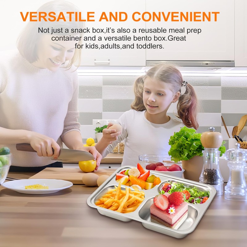 - Compartmental Design: Our snack box container features 4 divided compartments, perfect for packing a variety of snacks and fruits while keeping flavors distinct, Also, these snack containers are stackable, saving countertop space and keeping your kitchen neat & tidy