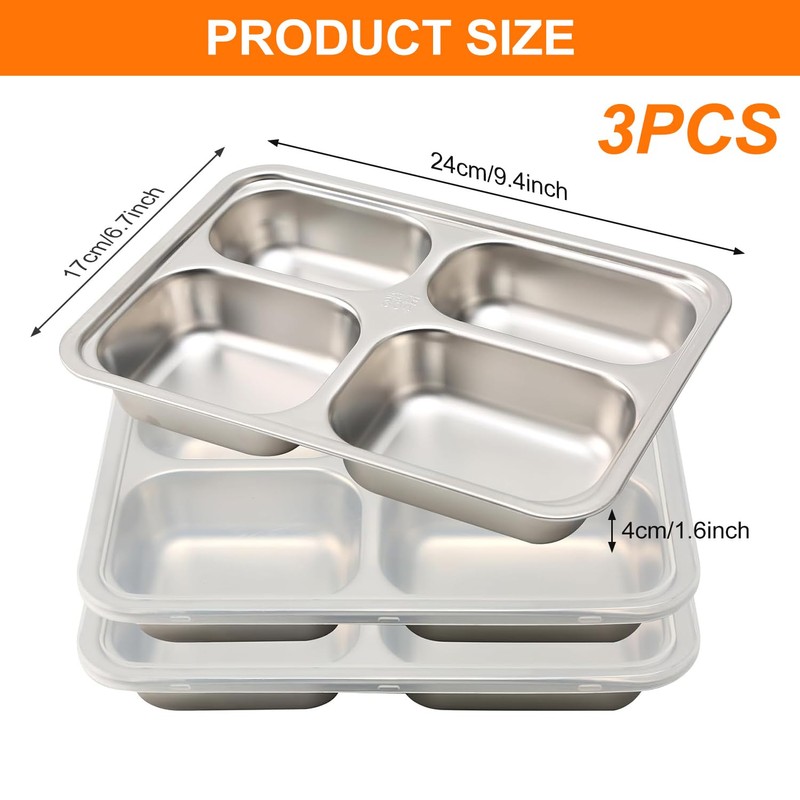 - Package Includes: you will get 3 pack of Stainless Steel food containers with 4 divided compartments, the overall size of each one measures approx. 24 x 17 x 4.2 cm/9.44 x 6.69 x 1.65 inch, Unlike plastic snack boxes, our bento snack boxes resist heat and remain durable
