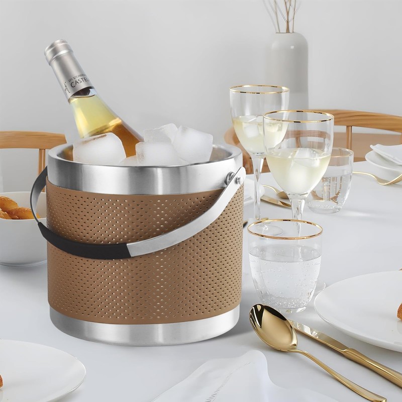 - 【Stylish & Functional Leather Design】Elevate your party with a premium leather exterior that combines sophistication and practicality. The ice bucket textured leather finish ensures a non-slip grip while adding a touch of rustic elegance to any setting—perfect for cocktail bar, dinner parties, weddings, or backyard BBQs. The 112-oz ice bucket can hold 5+ cans or 150-170 standard-size ice cubes, perfect for a cocktail party of 10 people.