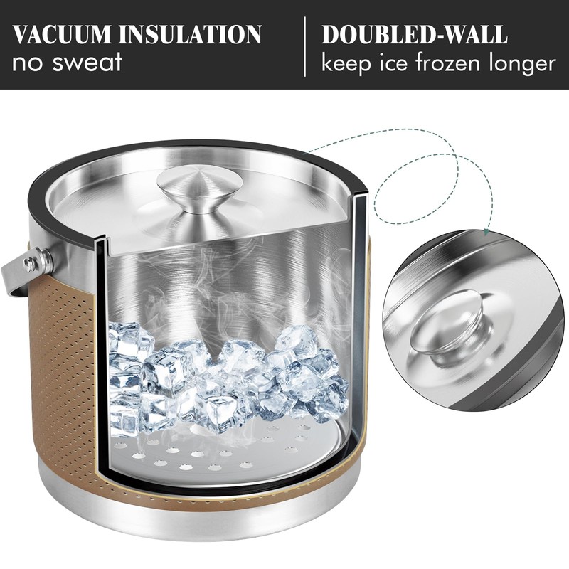 - 【Keep Ice Frozen Longer】The upgraded ice bucket with lid is made of double-wall insulated stainless steel material and silicone sealing lid, which keeps drinks chilled for a longer period of time even in hot summer days. Compared to a single wall ice bucket, the double wall insulated construction ensures that your wine stays perfectly chilled without any sweating, even during those long, lazy summer afternoons.