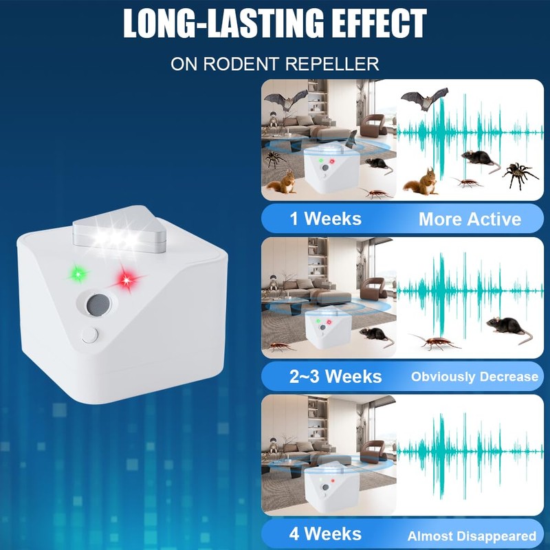 - 【SAFE AND HUMANIZED DESIGN】This is an indoor electronic rodent repeller with advanced technology and humanized design. This indoor rodent repeller is non-toxic, odorless and trap-free, completely safe for people and pets at home, and won't harm people or pets such as cats and dogs at home.