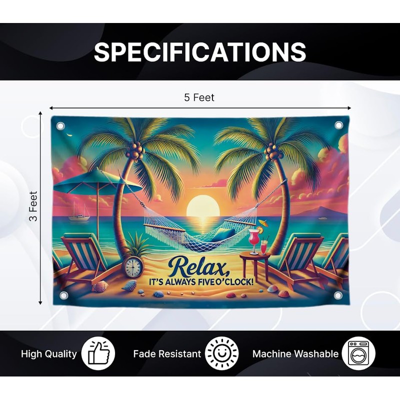 3x5 Feet Flag with 4 Brass Grommets - "Relax It's Always Five O'Clock" Relax Time Quote - Hammock and Beach Scene - Tropical Sunset Flag for Outdoor Decor - Relaxing Sunset Design Flags