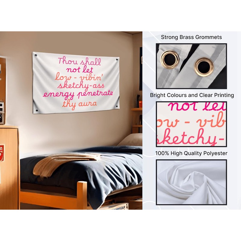 - Imported 100% polyester flag. Motivational flag quotes "Thou Shall Not Eat Low-Vibin Sketchy-Ass Energy Penetrate Thy Aura". Motivational flag for home, dorm, room, cave and also wall poster for guys.