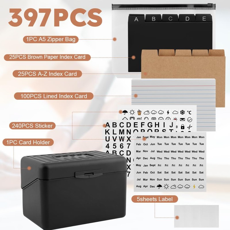 - 【PACKAGE INCLUDED】You will get 25pcs x A-Z index card, 25pcs x brown paper index card, 100pcs x lined index card, 3sheets x letter sticker(240pcs), 5sheets x label, 1pc x index card holder, 1pc x zipper bag.