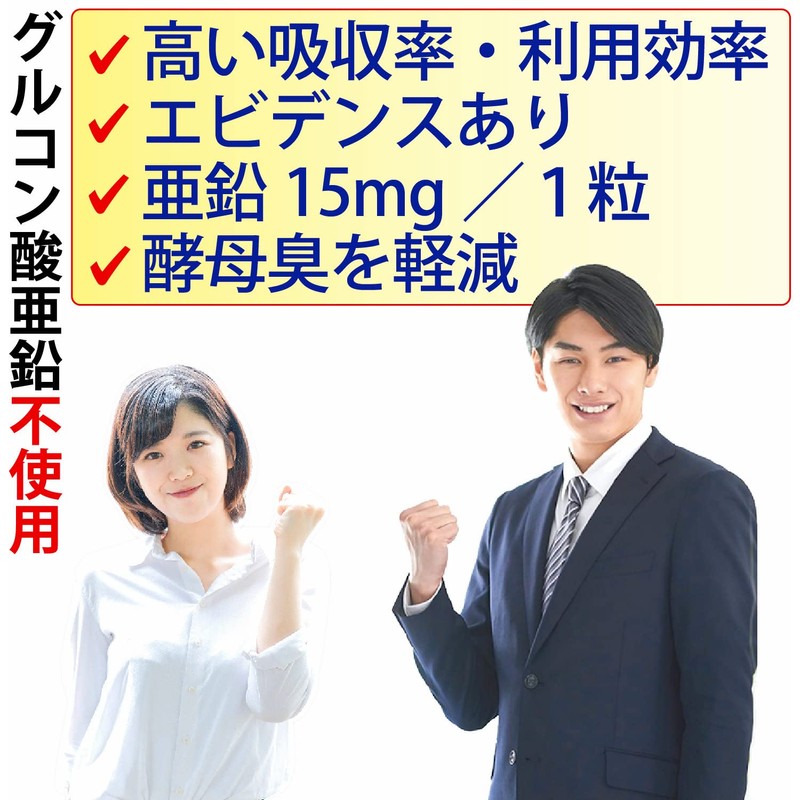 - 亜鉛の原料に亜鉛酵母(パン酵母を利用)を使用。一般的なサプリに配合されているグルコン酸亜鉛は不使用。1日1粒で15mgの亜鉛を手軽に摂取できます。