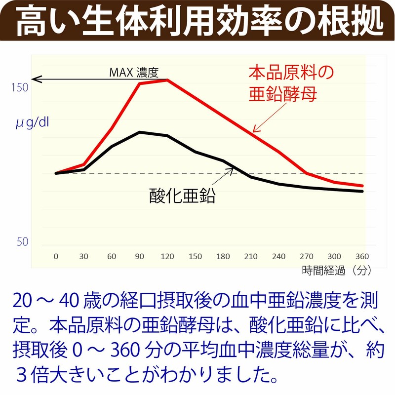 - 本品の亜鉛酵母は、in-vitro試験で、グルコン酸亜鉛に比べて、亜鉛の吸収率が約22%高いことを確認。腸の粘液分泌層では、グルコン酸亜鉛に比べて約23%吸収しやすいことを確認。本品の亜鉛酵母は、亜鉛の生体内利用効率も高いです。摂取後0~360分の平均血中濃度総量が酸化亜鉛に比べ約3倍。
