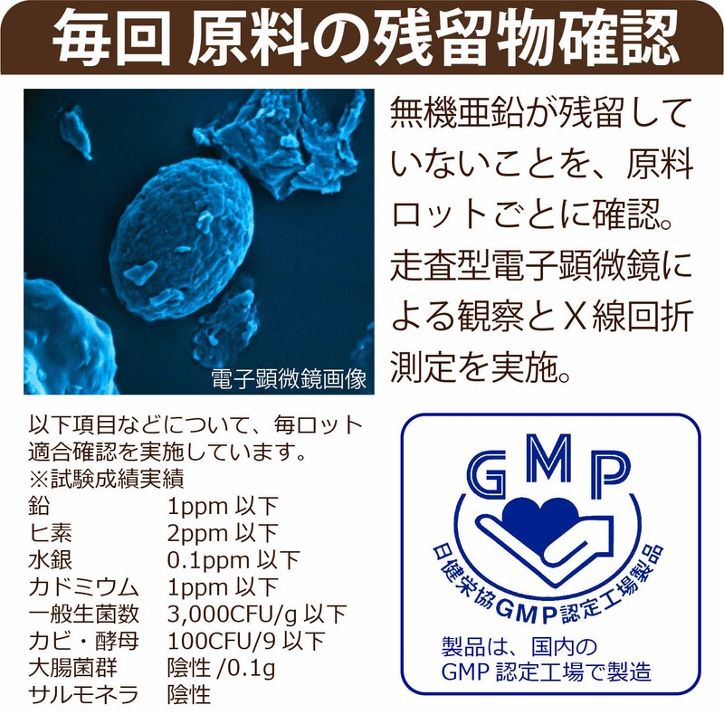 原材料名:酵母(亜鉛含有)(アメリカ製造)、還元麦芽糖水飴/粉末セルロース、二酸化ケイ素、ステアリン酸Ca