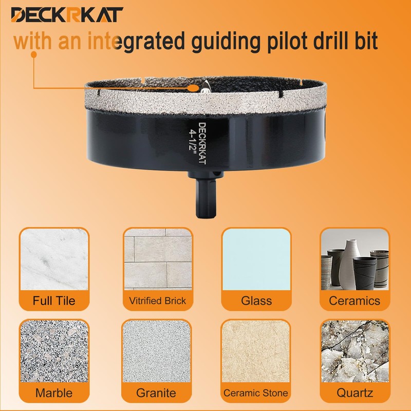 - High-Quality Diamond Hole-Saw Bits: Includes two premium 4-1/2" diamond-tipped hole saws plus guiding pilot drill bits centrally placed for precision drilling on various hard surfaces.