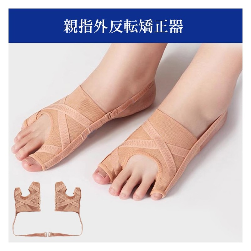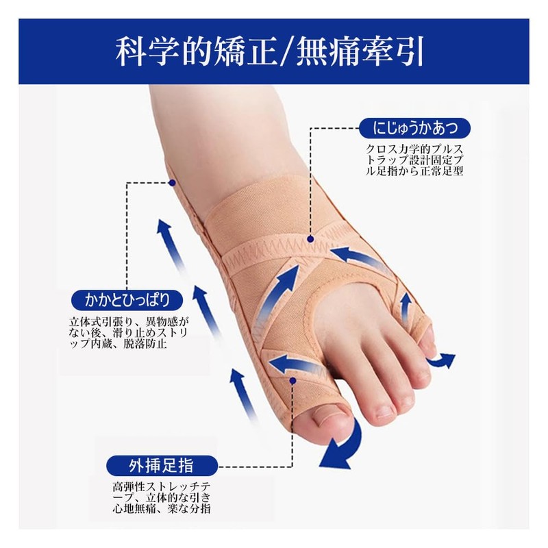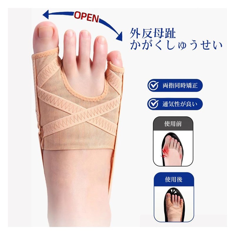 - 【つま先の保護】:この製品は小指と親指の両方を同時にサポートし、2つの伸縮性のあるゴムストラップを通じて足の甲に圧力をかけます。かかと部分にはズレ防止のストラップも付いているので、毎日履いても足のサイズに合わせて定期的に調整していただけます。