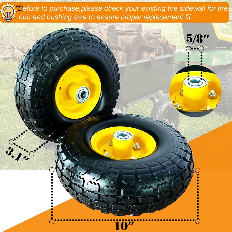 - ✅【Size】Model:4.10/3.5-4 Tires and Wheels Flat Free;Diameter 10’’;Tire Width 3.1"; Axle Bore Diameter: 5/8";hub offset:2.1". Please Check Carefully Before Buying To Make Sure the Tires Match.Suitable for Dynamic Load-Bearing, Not Suitable for Static Load-bearing.