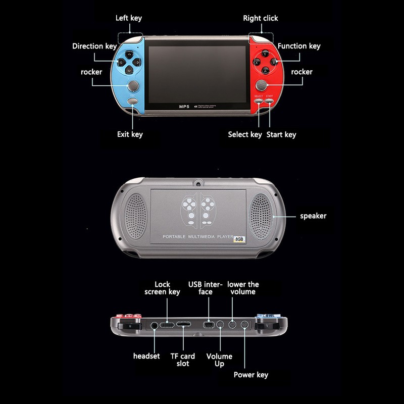 1、1. 4.3 inch screen: Full color screen with a display ratio of 16:9. Just put it in the palm of the children, with the lightest portable game console in the pocket. Let you enjoy the best visual experience. 2、2. Multi-function: It s not only a game console, but also a music player, video player, camera, DV, recorder, photo viewer, e-book, stopwatch, calculator. The capacity of this game console is 8 GB. Built-in 10,000 games (more than 1,000 are not repeated). 3、3. Power supply: Built‑in 1000mAh high‑capacity polymer lithium battery, long standby time and lifespan, and charge via USB cable. Support long time game and music playback. Release joy and energy during the journey or long‑distance travel. 4、4. Design: The game console is stylish and durable. The control is precise and firm. With built-in speakers, it is convenient to carry games. These unique features make it an undoubtedly retro arcade game machine, the best Christmas gift for family and friends. 5、