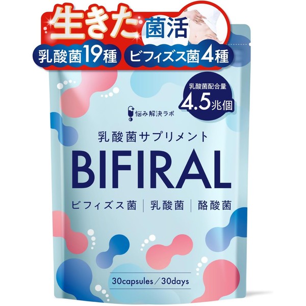 🥛【1袋で4.5兆個の乳酸菌(ヨーグルト約450個分)】BIFRAL乳酸菌サプリメントは、乳酸菌・ビフィズス菌・酪酸菌・ナットウキナーゼを贅沢配合し、1日1粒で体内フローラすっきり生活をサポート。 🥛【善玉菌の代表を贅沢配合】善玉菌の代表であるビフィズス菌を4種、乳酸菌を19種配合し、「生きた」ビフィズス菌、「生きた」乳酸菌による生きた菌活を推奨します。🥛【安心の国内GMP認定工場で製造されたBIFIRAL】BIFIRALは、安心して摂取いただける様、品質管理に徹底的に配慮した国内GMP認定工場で生産されています。GMP認定は医薬品製造にも適用される厳しい基準を満たした証明であり、品質管理においても万全を期しています。健康志向の方には、是非ともおすすめの商品です。🥛【BIFIRALはこんな方におすすめしたい】BIFIRALは体内フローラを改善したい人やキレイと健やかな身体づくりに取り組みたい人にはぴったりの商品です。不足しがちな乳酸菌・ビフィズス菌・酪酸菌・ナットウキナーゼがしっかり含まれているため、毎日の健康維持に、是非とも取り入れてみてください。🥛【長く続けて欲しい理由】飲みやすくニオイも気にならない1日1粒のカプセルタイプです。 🥛【耐酸性カプセルを採用】胃で溶けにくく、生きて奥まで届く『耐酸性カプセル』を採用しています。一般的なカプセルは胃で溶けやすいため、耐酸性カプセルなら熱や胃酸に弱い菌たちを生きたまま奥まで届けてくれます。 🥛【内容量】30粒(約30日分)45g 🥛【お召し上がり方法】1日1粒を目安に、水またはぬるま湯でお召し上がりください。 🥛【保管方法】直射日光・高温多湿の場所を避けて保管してください。 🥛【原材料名】還元難消化性デキストリン(国内製造)、イヌリン(食物繊維)、乳酸菌末(乳酸菌(殺菌)、デキストリン)、乳酸菌凍結乾燥末(マルトデキストリン、乳酸菌凍結乾燥末(乳成分を含む))、ガラクトオリゴ糖、α-リポ酸、ザクロ果汁粉末(ザクロ果汁、デキストリン)、赤ワイン抽出物、酵酸菌末(コーンスターチ、酵酸菌)(乳成分・大豆を含む)、納豆菌培養エキス末(デキストリン、納豆菌培養エキス)(大豆を含む)、乳酸菌生産物質(大豆を含む)、フラクトオリゴ糖、ラフィノース、キシロオリゴ糖/結晶セルロース、HPMC、ステアリン酸カルシウム、ゲル化剤(ジェランガム)、リン酸三カルシウム、ラクトフェリン(乳由来)、二酸化ケイ素、トマト色素 🥛MADE IN JAPAN