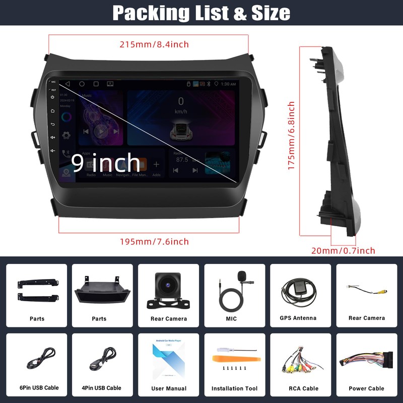 - 【Android 13 Car Stereo for Hyundai Santa Fe IX45】The carplay car stereo fits for Hyundai Santa Fe IX45 2013 2014 2015 2016 2017 2018. Android 13 system, 9'' Capacitive touch screen, screen size is 228mm*218mm*130mm,4G RAM+64G ROM, running smoothly in colleges and universities.A variety of EQ sound effects scene selection.Capacitive touch screen,1280*720 high resolution, Support 1080p video, will provide you the Excellent experience in the car