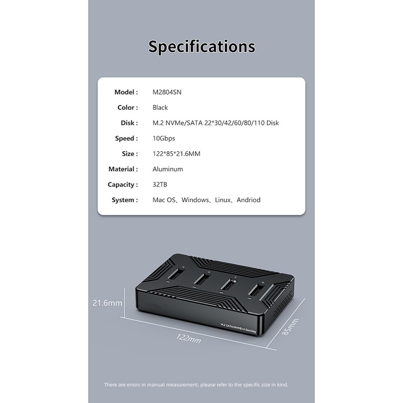 - Support SATA and NVMe: The aluminum SSD enclosure supports two different M.2 hard drives, 2230/2242/2260/2280/22110mm size M.2 NVMe and SATA. NVMe and SATA docking station only supports M key and B+M key, Supports 4 M.2 NVMe/SATA hard disk reads and writes at the same time. It can be used to expand storage capacity by connecting to a PC or smart phone, making it a versatile option for up to 4x8TB data storage.