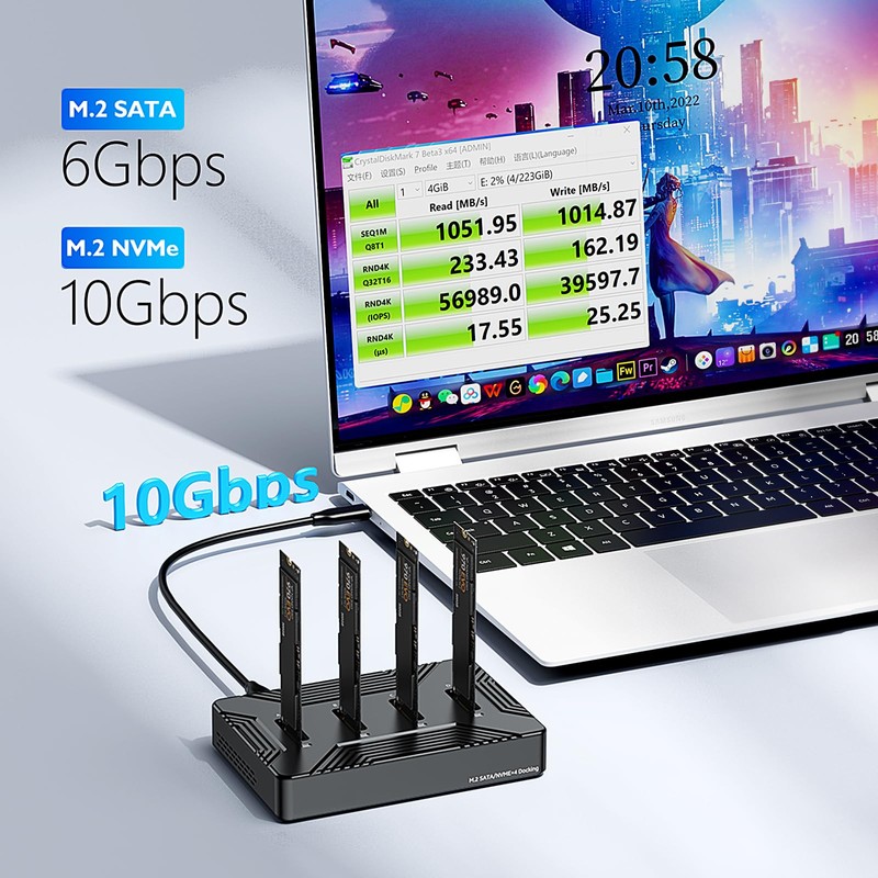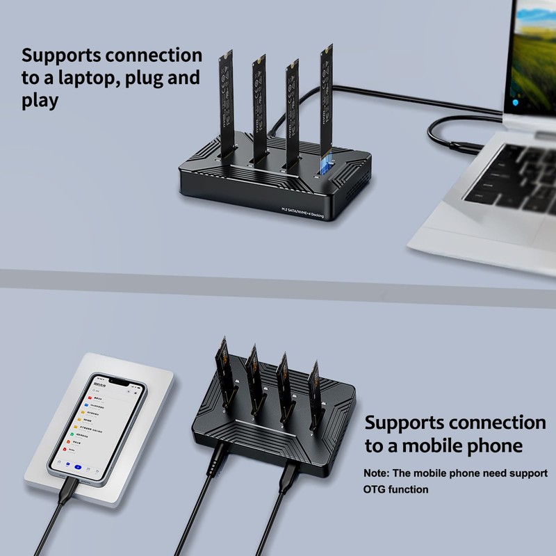- High-Speed Performance: With USB 3.2 Gen2 technology, this M.2 NVME/SATA docking station supports up to NVME 10Gbps and SATA 6Gbps transfer speed, allowing for quick and efficient data transfer. It is equipped with the Rtl9210b main control chip which provides fast and stable performance for your NVME and SATA SSDs.[Note: this 4 bay USB NVMe adapter supports read/write only, M.2 SSD USB DO NOT support offline duplicator/cloner].
