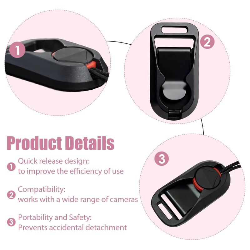 - Installation steps: Three steps for more efficiency. Attach one end of the carrying strap to the camera, pass the strap through the quick adjustment plate and finally attach the quick mounting plate to the buckle to complete the assembly. The operation is simple and practical.