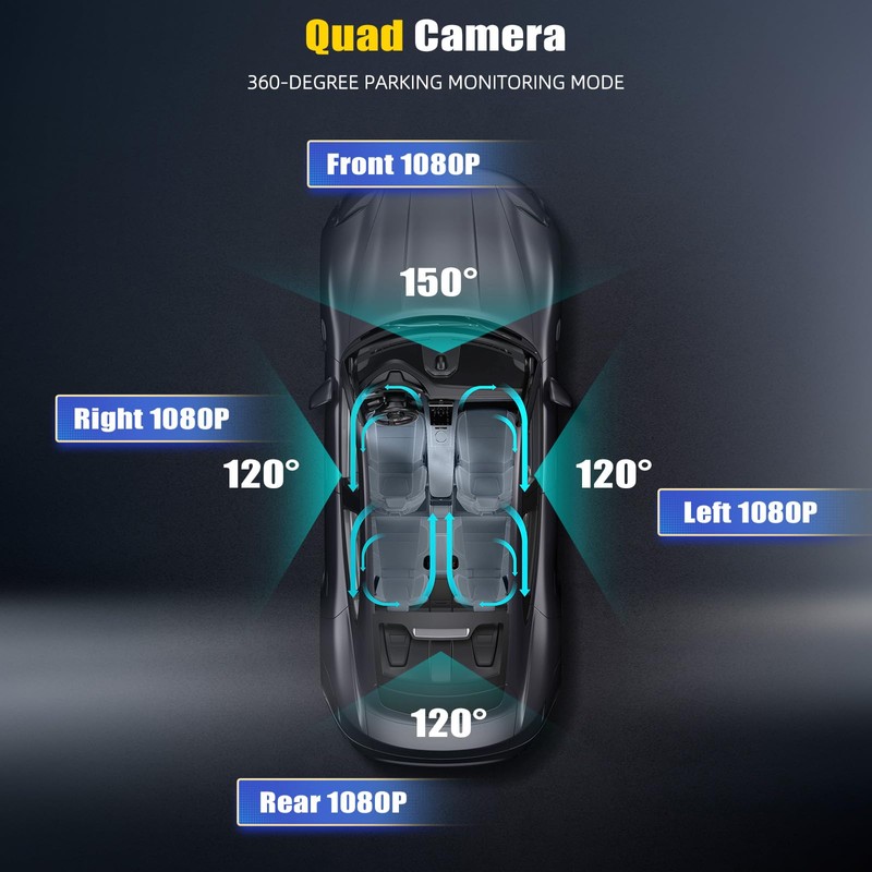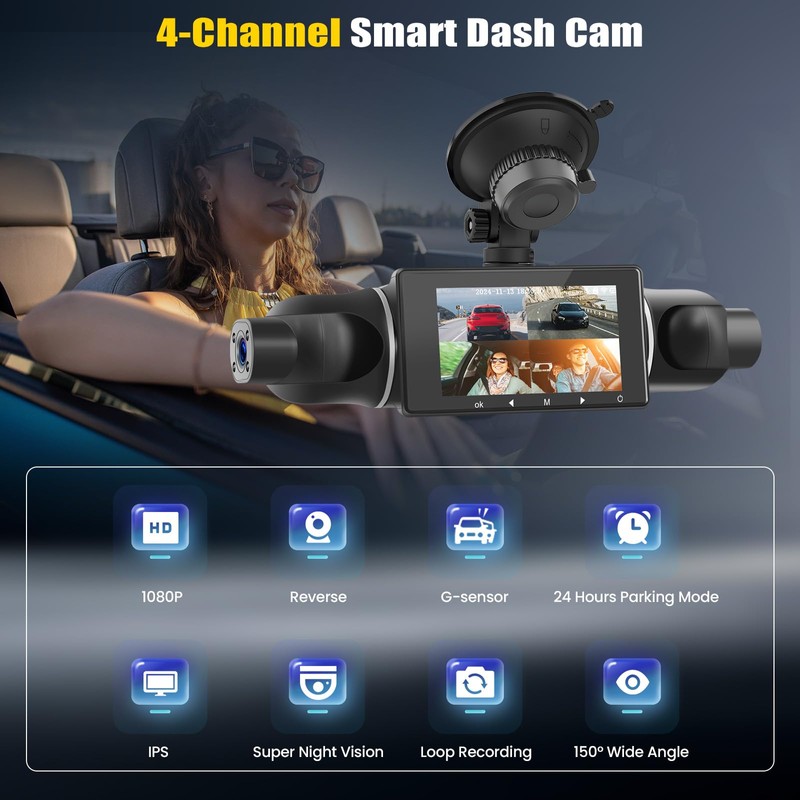 4 Channel Dash Cam Front and Rear Inside Left Right,3 Inch 1080P Dash Camera for Cars Car Camera with APP Control,Night Vision,Loop Recording,G-Sensor,Parking Assistance,24H Parking Monitor
