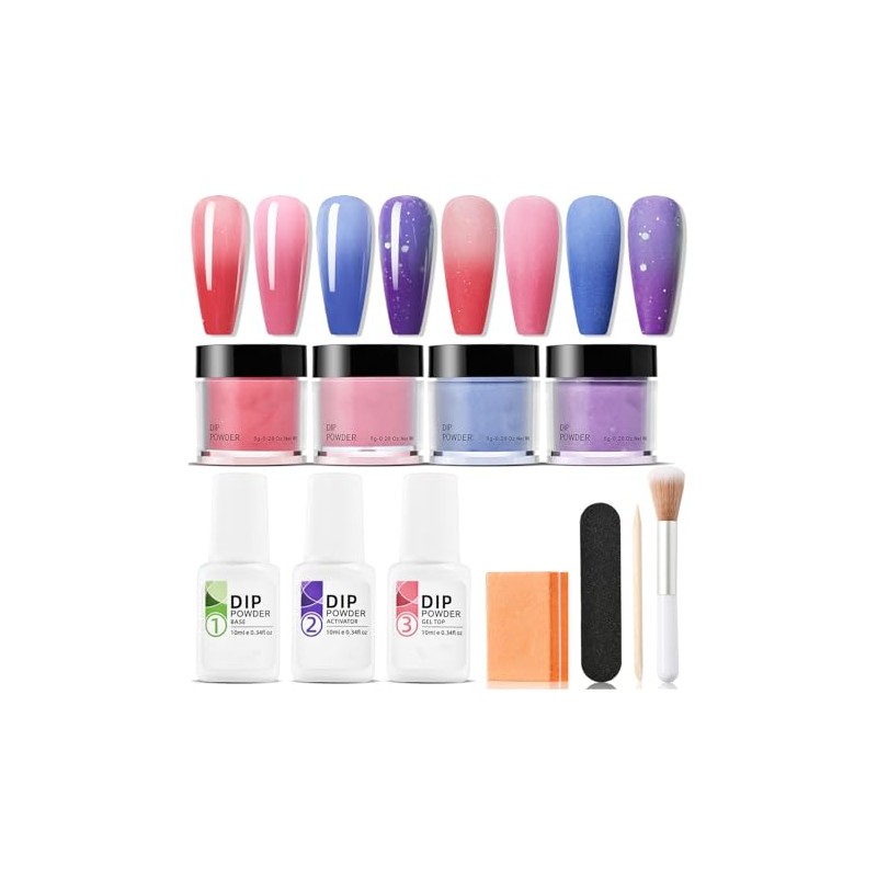 4 Colours Nail Dipping Powder Kit - Colour Changing Dip Powder Set with Base Top Coat Activator - No UV/LED Needed DIY Art for Beginners