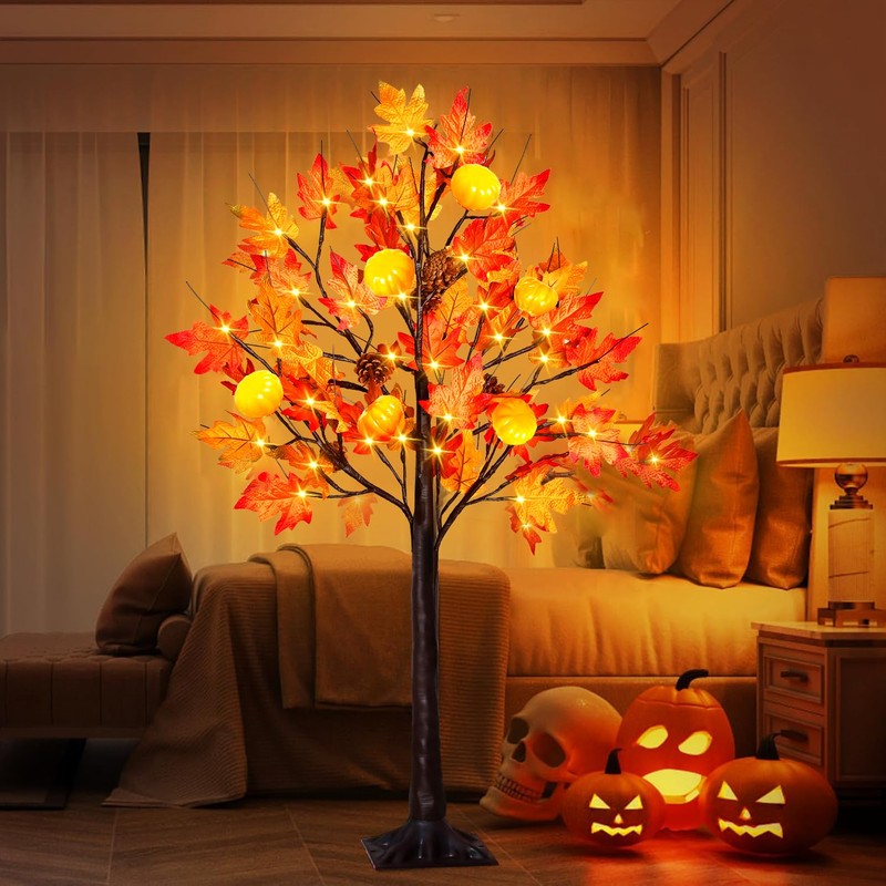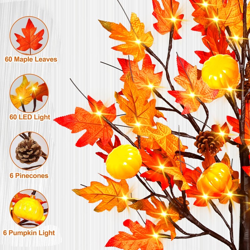 - [ Perfect Fall Themed Decor ] Each maple tree light is equipped with 60 LED lights, 6 pumpkin lampshades, 6 Pinecones, maple leaves are design in different colors, transitions from yellow to red, which looks realistic and vibrant, provide warm colors to any room.