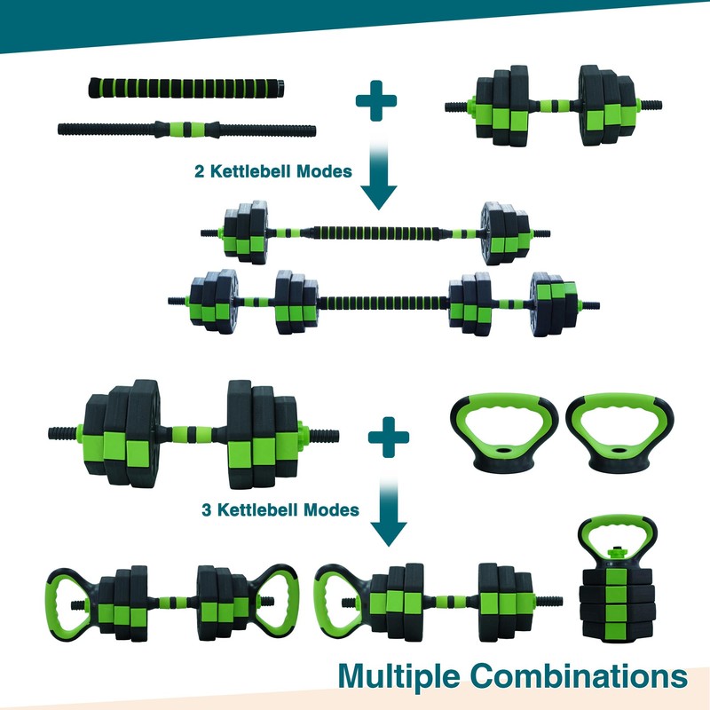 • 4 in 1 Multifunctional Dumbbell Set: This versatile dumbbell set quickly converts into dumbbells, barbells, kettlebells, and push-up stands, making it suitable for a range of exercises, including bench presses, squats, and more. Enjoy multifaceted fitness!