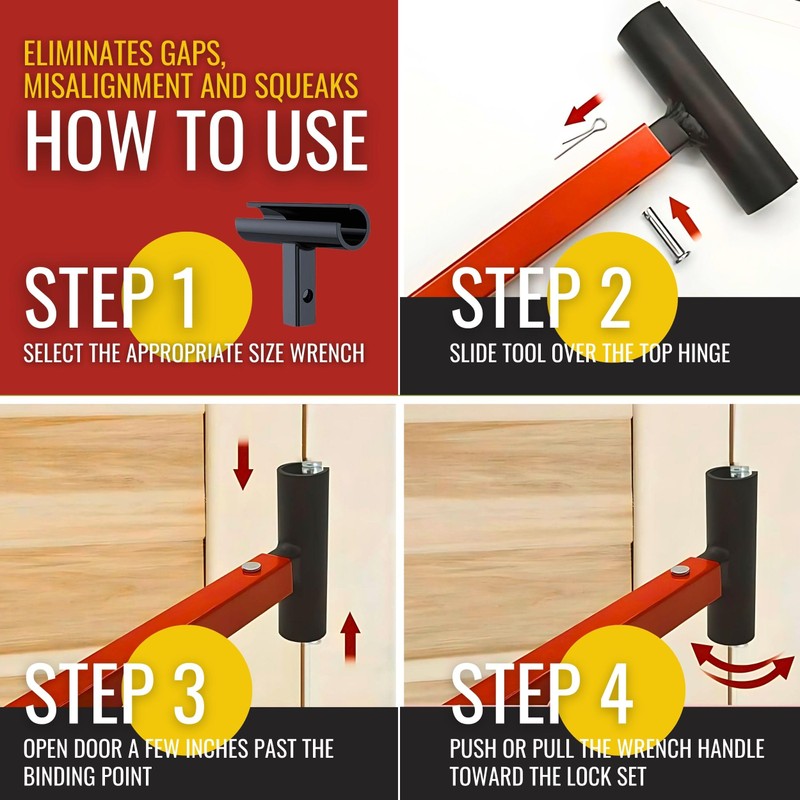 • VERSATILE WRENCH SIZES. Door hinge adjusting tool comes with 4 different door gap wrench sizes, catering to various door hinge specifications: 0.6”, 0.74”, 0.86”, 0.98” diameter. Efficiently tackle a wide range of door adjustment tasks with ease