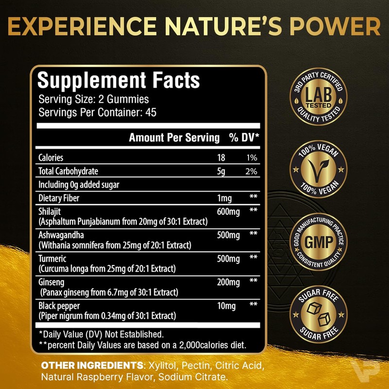 POWERFUL, NATURAL INGREDIENTS FOR ENHANCED WELL-BEING: Crafted with 100% pure Himalayan Shilajit, our gummies are fortified with Ashwagandha, Turmeric, and Ginseng, providing a blend of essential nutrients that promote vitality, mental clarity, and stress management. These gummies are the perfect addition to any wellness routine.
