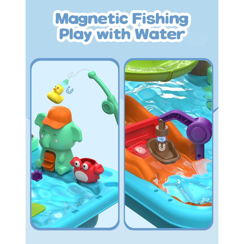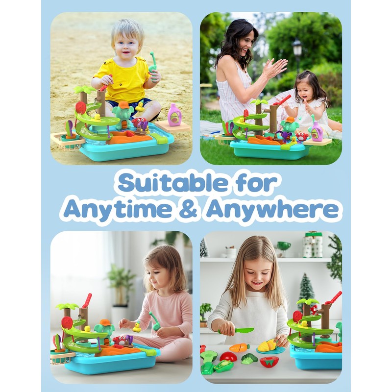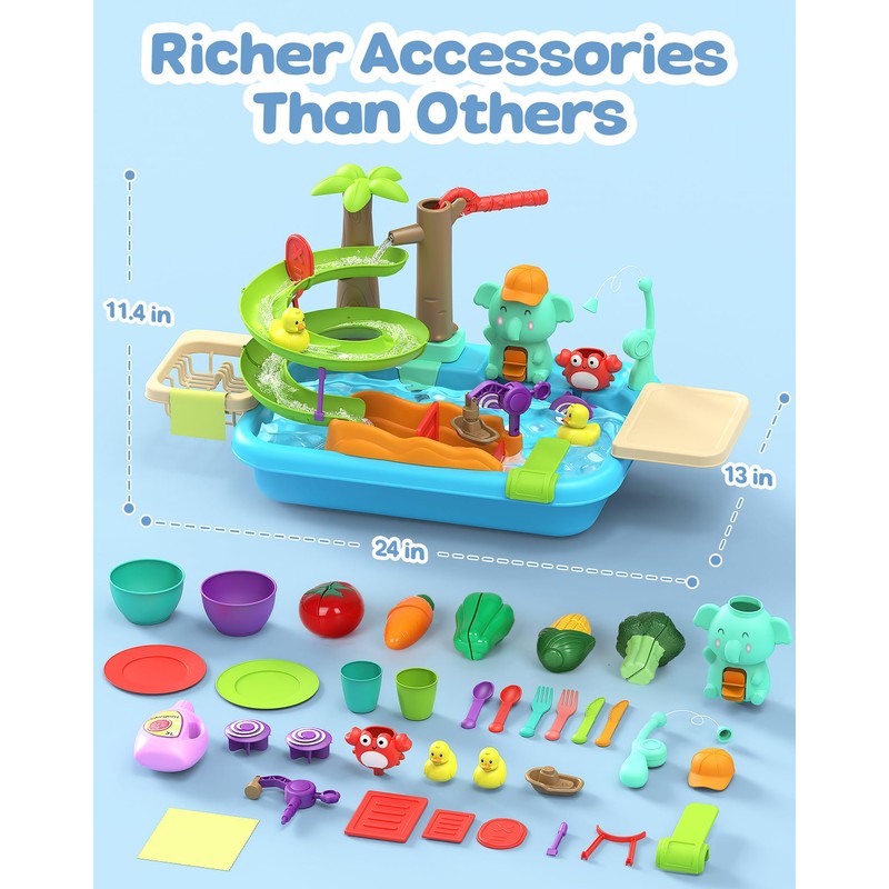 - Multiple ways to play:Get ready for a whirlwind of fun with the built-in water slide track – watch ducks and boats zip down the stream,all thanks to the magical power of magnets! That's right, your kids can channel their inner marine biologist and fishing expert without ever getting their feet wet.The play sink comes with a springboard, providing that extra bounce to their creative play.They can make a daring leap for joy as they send their aquatic friends flying!And for the little chef in training,with pretend utensils and faux food,your cooks can whip up some imaginary culinary masterpieces