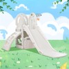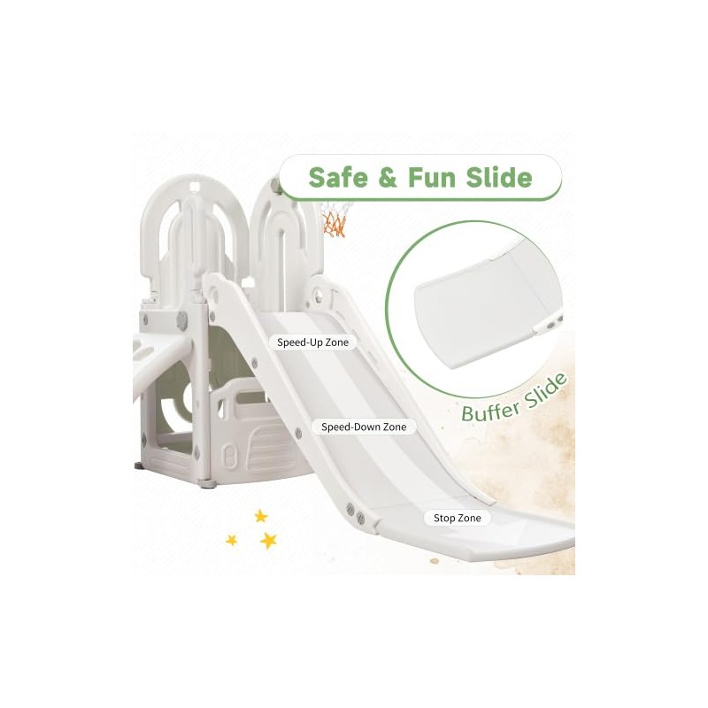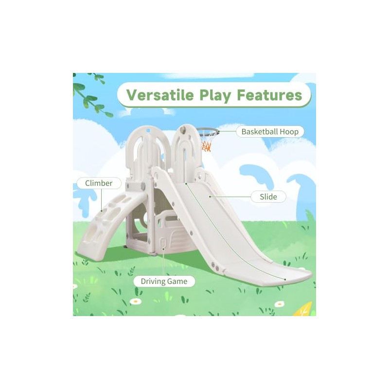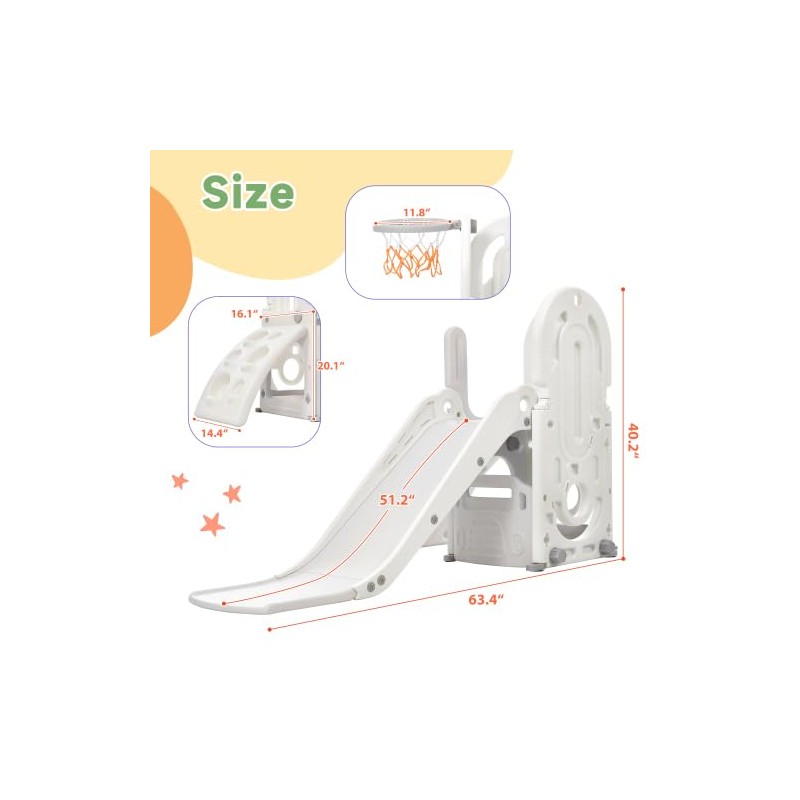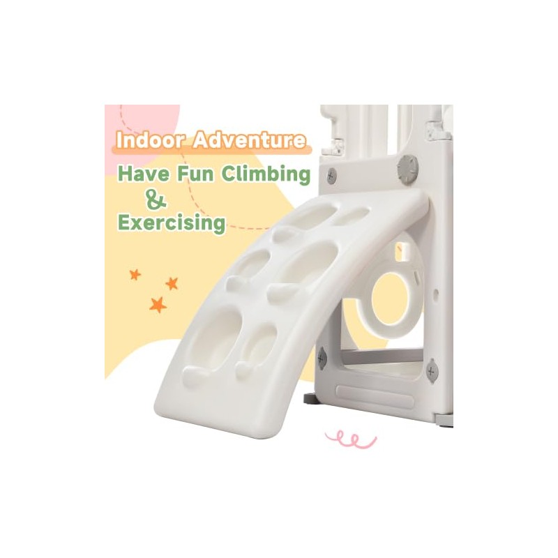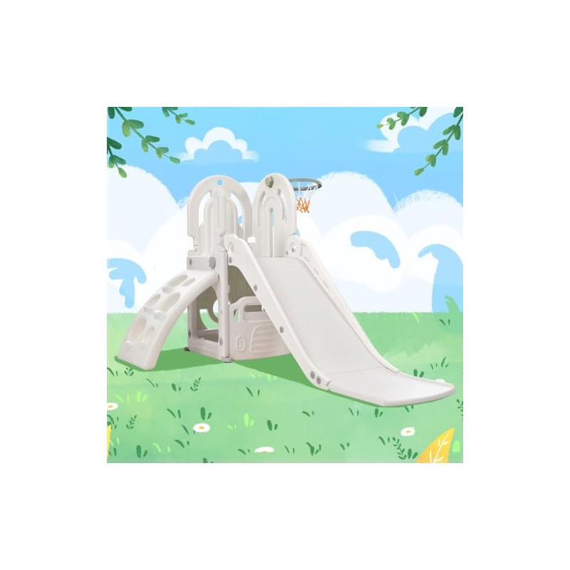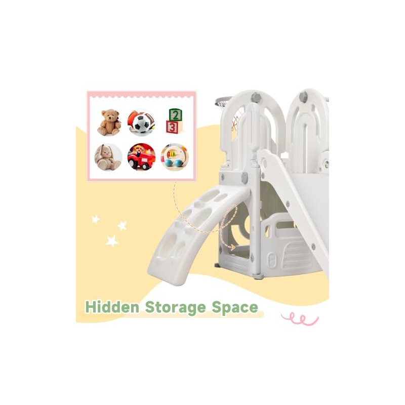 - [Children's Playground 4in1] Refreshing styling design! Delicate and cute freestanding climber and slide set for toddlers with three functional parts: 1 slide, 1 climbing ramp, 1 basketball hoop, and 1 hidden space for toy storage. This set allows children to completely release their playful nature, and they can play with their friends for hours!