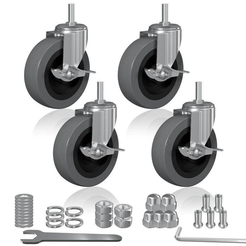 - Easy Installation: Replacement hardware included! 4 inch swivel stem casters Set of 4 with side brake come with 5 x splint nuts, 5 x hex nuts, 5 x cap nuts, 5 x spring lock washers, 10 x flat washers, 1 x hex key, 1 x wrench for quick installation