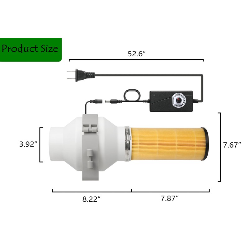 - Perfect Smart Combination Inline Duct Fan Air Filtration Kit : Includes 4” Inline Duct Fan, Speed Controller, HEPA Filter; Ideal for moving and transporting air in various air circulation and ventilation projects;The Speech controller allows for precise and easy control over the fan speed, airflow, and many other elements, stabilizing and optimizing your growth environment