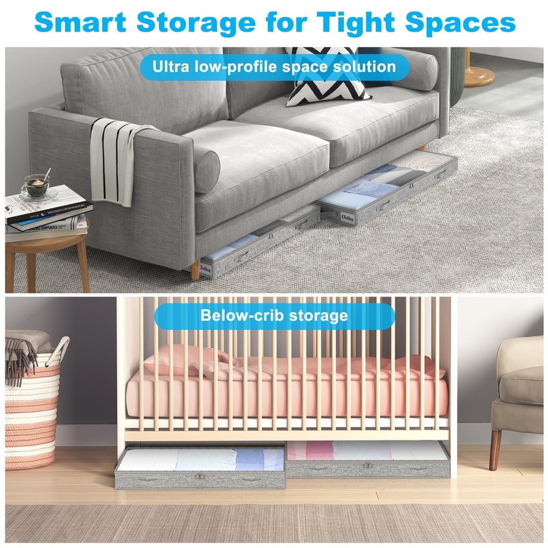 - LOW PROFILE UNDER 4 INCHES but Ample Capacity: Measuring 40" x 20" x 3.7", these under bed storage containers of the Flex series can fit effortlessly under almost all beds and couches, while providing ample space for clothes, comforter, bedding, toys and blanket storage. Their low profile makes them a versatile solution for closet organizers and storage, especially in college dorms and apartments where space is tight.
