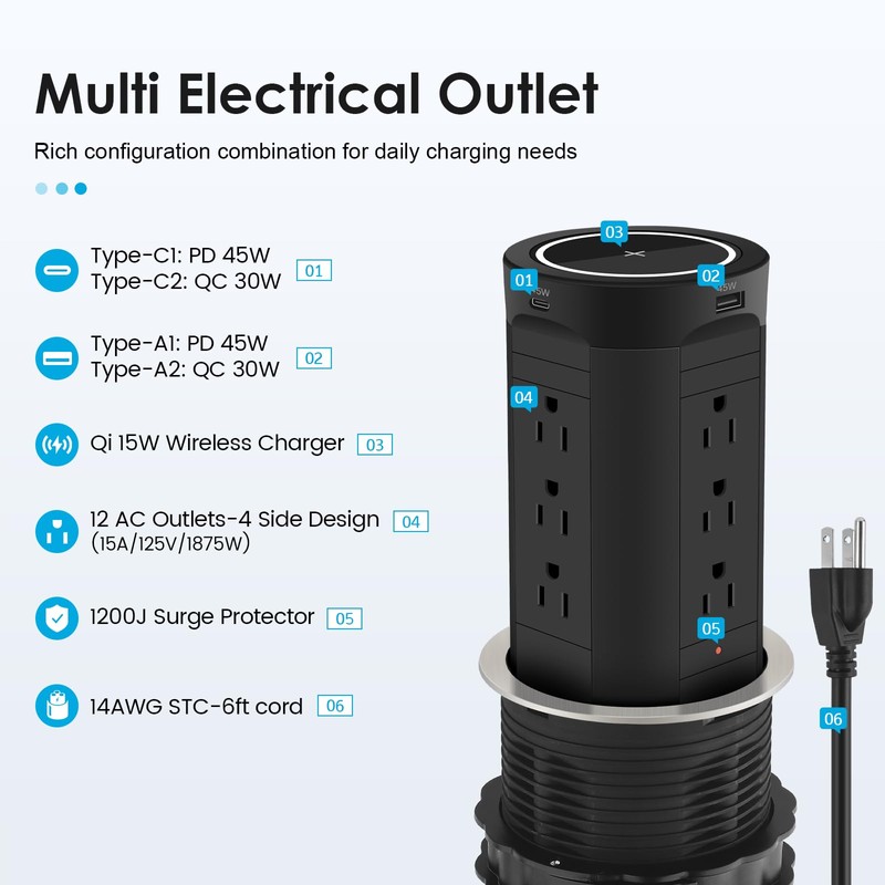 1. Boasting 12 versatile AC outlets, it easily handles all your devices simultaneously, from laptops and monitors to kitchen appliances. 2. Stay future-proof with 2 USB-C ports and 2 USB-A ports, providing a combined 45W USB Power Delivery to quickly charge smartphones, tablets, and even newer laptops. 3. And that's not all; enjoy 15W wireless charging for Qi-enabled devices, perfect for effortless top-ups without the clutter of cables. 4. Safety is paramount; the HEZI Power Station is equipped with 1200J Surge Protection to shield your electronics from unexpected voltage spikes. Its 15A tamper-resistant outlets add an extra layer of security, ensuring peace of mind for families with children. 5. Installation is a breeze—fitting into a standard 4-inch hole, this automatic pop-up mechanism elegantly rises when needed and discreetly hides away when not in use, preserving your interior aesthetics. Say goodbye to tangled cords and hello to a clutter-free environment.