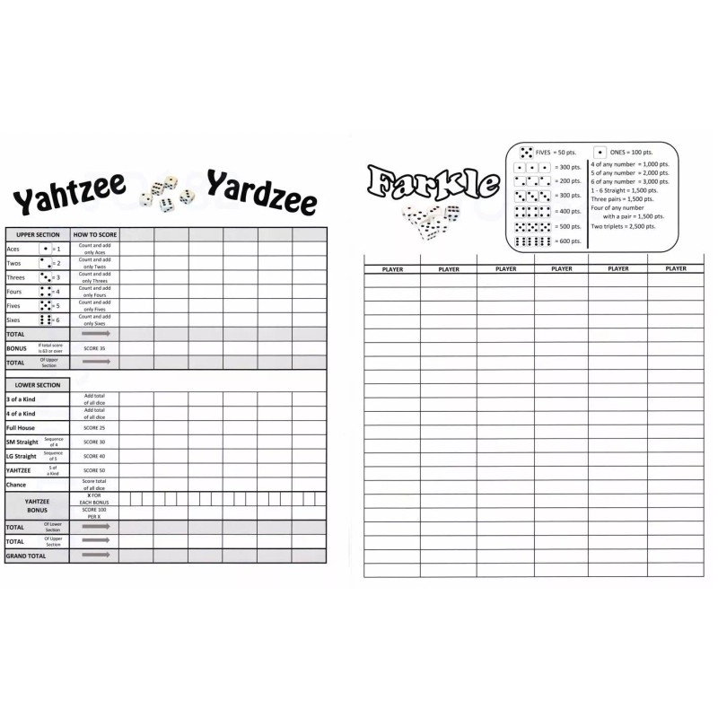 4 Laminated Farkle Yahtzee Yardzee Score Sheets, Dry Erase-Reusable Double Sided
