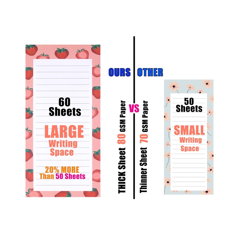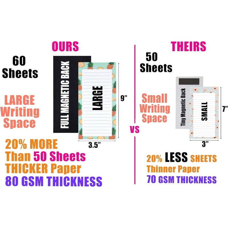 - LARGE PAGE SIZE 60 SHEETS - 4 Large magnetic memo pads measure 9'' Height x 3.5'' Width in inches, BIG SHEET SIZE provide more space for comfortably writing notes. Each pad contains 60 sheets for long lasting use (total 240 sheets) sheets made with high quality thick uncoated paper, great for writing with less chance of ink bleed through. 4 realistic fruits themes, total 4 unique large note pads magnetic.