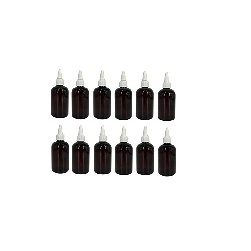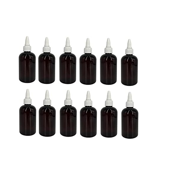 4 oz Amber Boston Plastic Bottles -12 Pack Empty Bottle Refillable - BPA Free - Essential Oils - Aromatherapy | White Twist Top Caps - Made in the USA - by Natural Farms