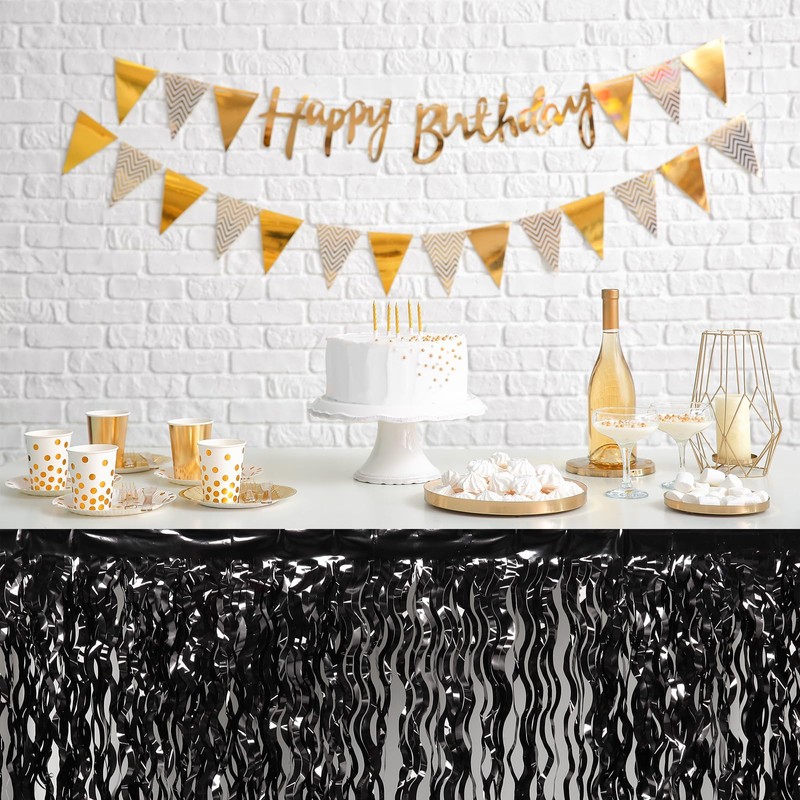 - [PREMIUM MATERIAL}: Our tinsel foil fringe table skirt is made of high-quality PET material, which is safe and recyclable. The surface is shining and full of luster and the smooth touch makes tassels easy to tidy up and not easy to knot.