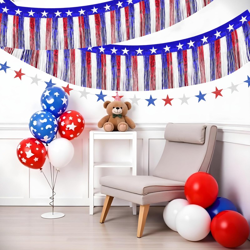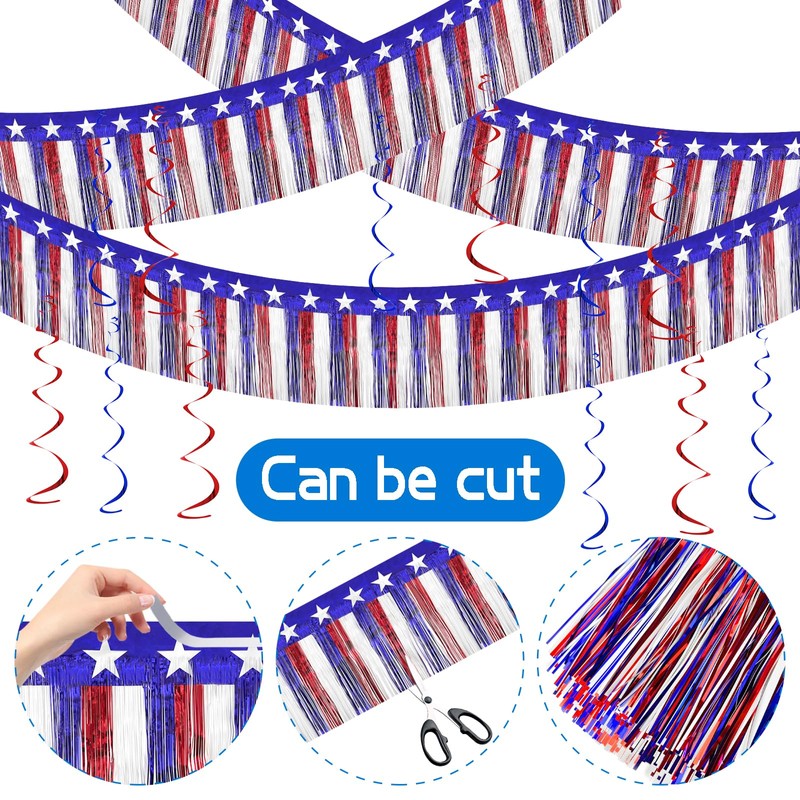 4 Pack 4th of July Decorations, 39 Feet Patriotic Foil Fringe Garland Independence Red White and Blue Metallic Tinsel Garland and 26ft Star Banner Backdrop for Floats Flag Day Patriotic Party