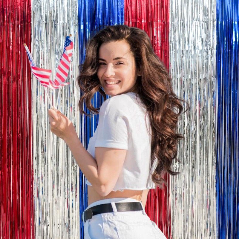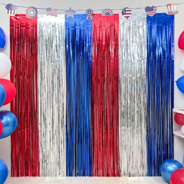 4 Pack 4th of July Foil Fringe Curtains, Red White and Blue Tinsel Streamers Backdrop, Photo Backdrop Party Decorations for America Patriotic Party, Memorial Day, Independence Day, Labor Day