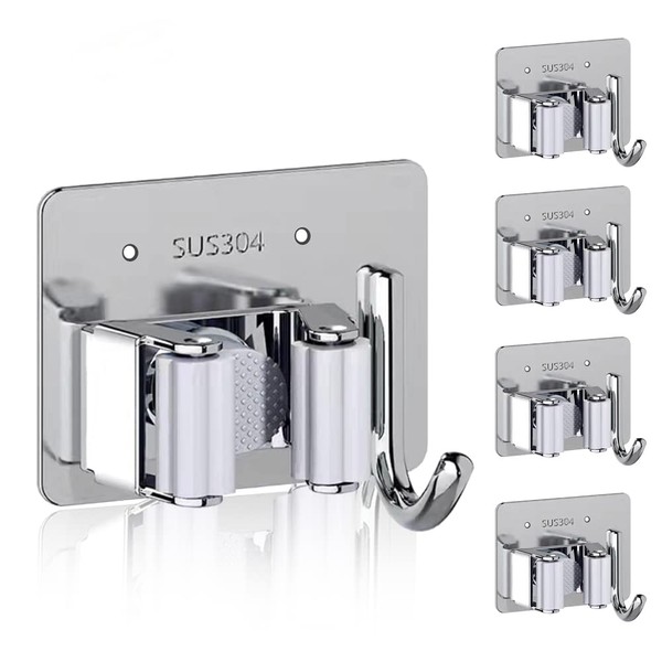 4 Pack Broom Holder Wall Mount,Heavy Duty Stainless Steel Broom Holder,Mop and Broom Holder,Mop Holder,Broom Hanger (silver, 4pack, with hook,silver)