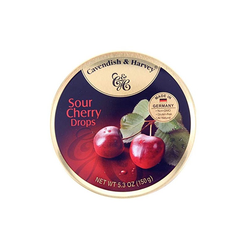 Finally...A luxury indulgence for the senses in a fruit flavored hard candy! Enjoy a fruity indulgence and extraordinary flavors in a premium gold tin with Cavendish and Harvey hard candies. For over seventy years Cavendish and Harvey have created candies known for consistent taste enjoyment and constant high quality. Packaged in a resealable candy tin the candy drops are dusted with confectioner's sugar promise pure fruity joy down to the last candy. Natural fruit flavoring and colors are combined to create a unique candy drop that's imported from Germany. Featured Flavors: Sour Cherry Drops: Fruity cherry sweets with slight acidity that taste like they're fresh picked. Sour Lemon Drops: Fruity and sour lemon sweets are the perfect refresher for anytime. Orange Drops: Fruity drops that taste like sun-ripened oranges. Wild Berry Drops: The delicious berry mix of fine raspberries, blackberries and blueberries.