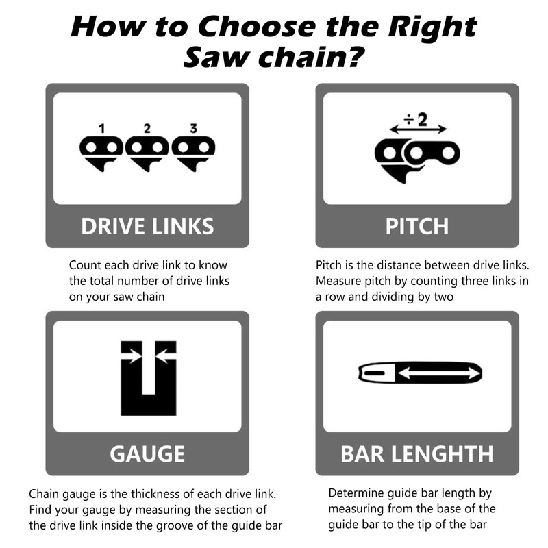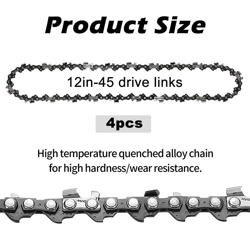- 【12 Inch Chainsaw Chain Set】This set includes 4 pieces of 12-inch (30 cm) chainsaw chains, all individually packaged for easy storage. Compatible with most chainsaws, the chains feature a pitch of 3/8"" LP, a gauge of 0.043", and 45 drive links.