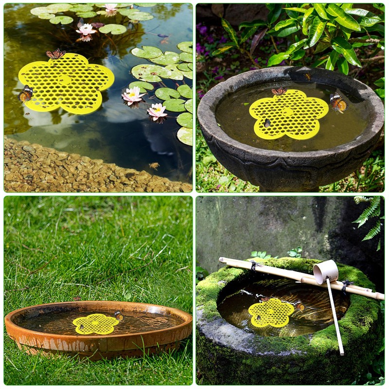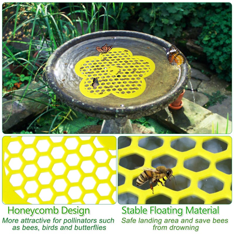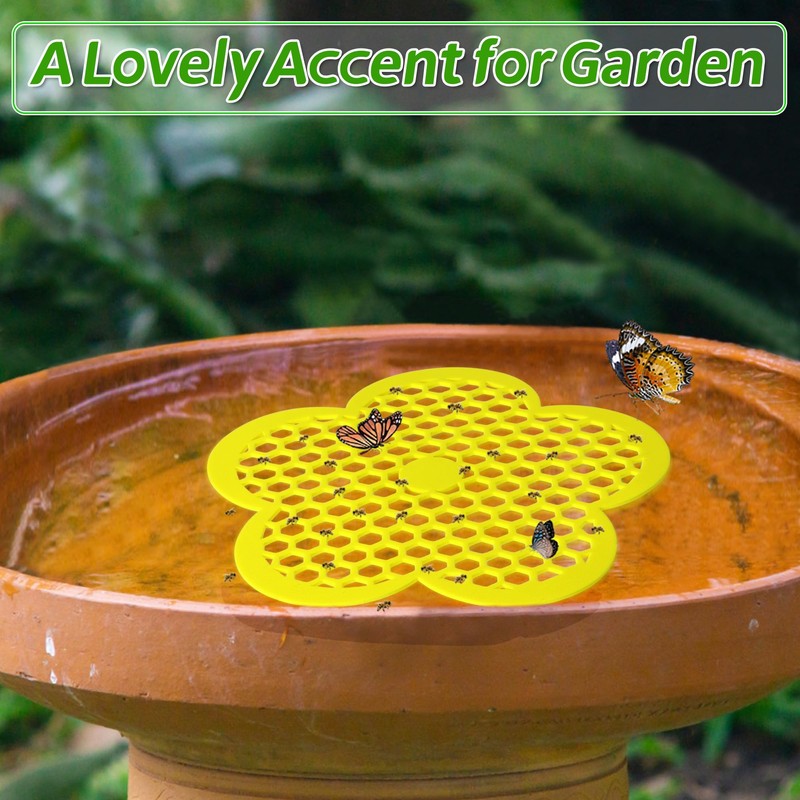 - 【Innovative Design】We designed this floating bee island in a striking, vibrant yellow color that is easy for bees to distinguish, honeycom texture and flower shape help attract pollinators such as bees, birds and butterflies to your garden.