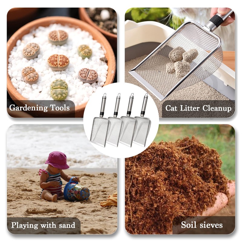 - Multi-Purpose Soil Sifter & Shovel Combo: Combines the functions of a soil sifter, shovel, and filter into one versatile tool. Features four interchangeable stainless steel mesh sizes (2mm, 2.8mm, 3.8mm, 5mm) for sifting soil, compost, sand, or rocks, while doubling as a practical solution for playground maintenance, pet litter cleanup, and other filtration tasks