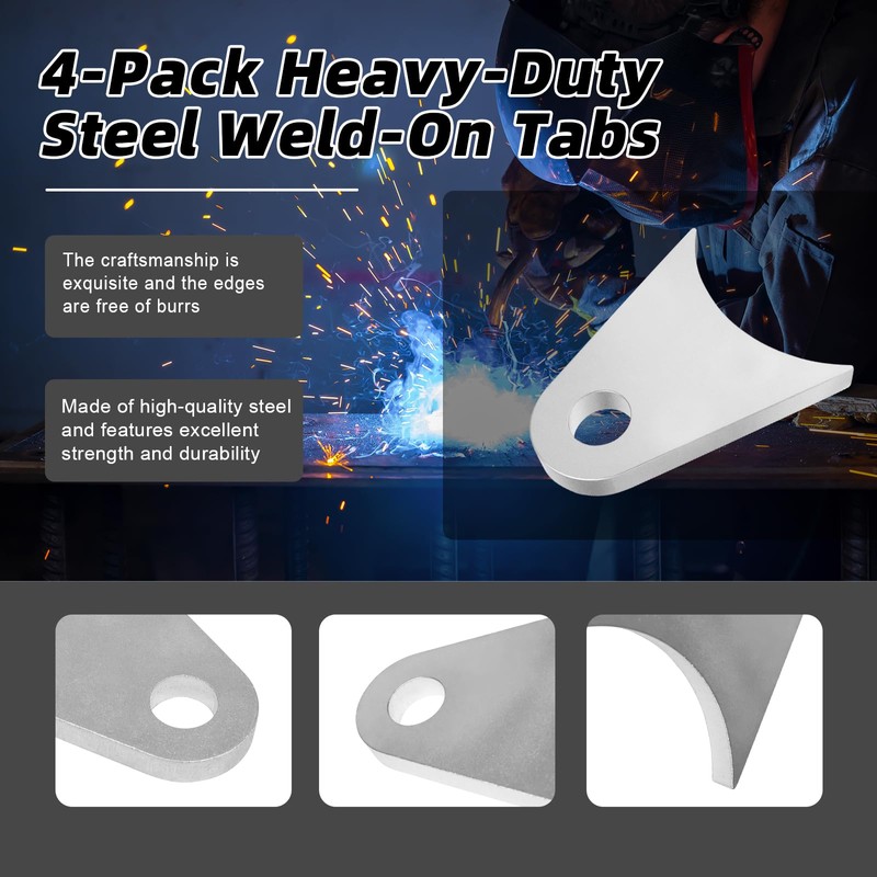 - Weld on tabs are made of high quality steel for excellent strength and durability, 1/4” thick steel tabs can withstand extreme vibration, pressure, not easy to break or deform, can be used for a long time.Shock tabs have burr-free edges and a rust-resistant metal surface, giving weld on shock mounts excellent anti-scratch and rust-resistant performance, the weld tabs can function stably in various environments.