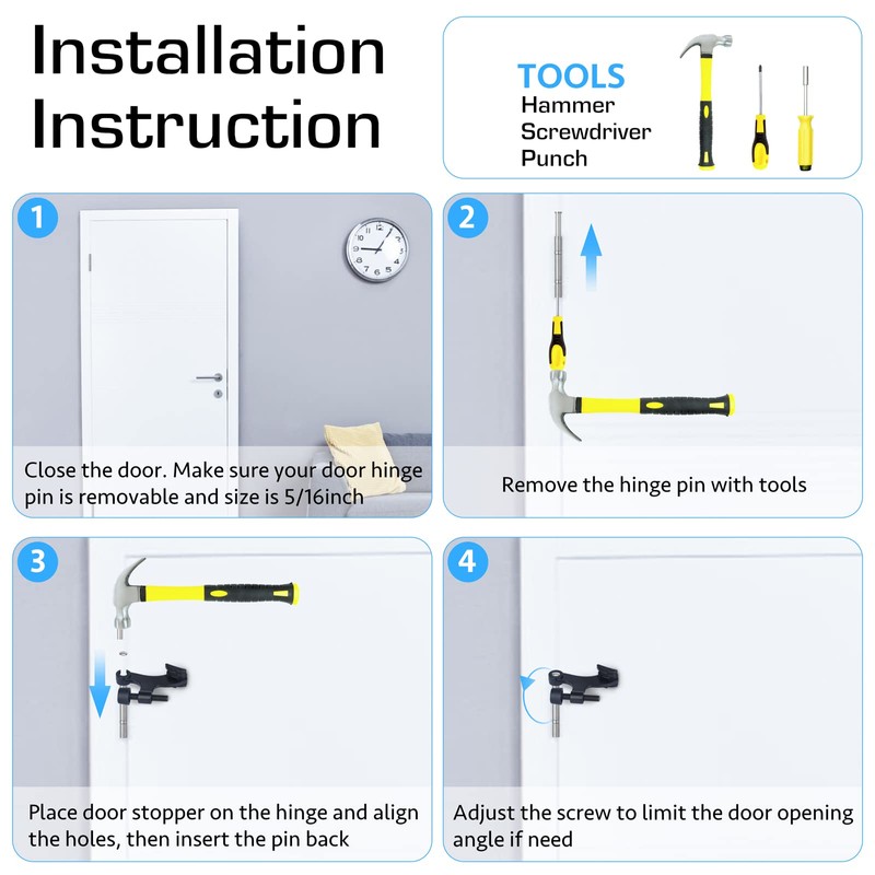 - Easy to Install: Just need a hammer and screwdriver to take off the pin from hinge, then place door stopper on the hinge and align the holes, and insert and punch the pin back at last, also you can adjust the screw if need.