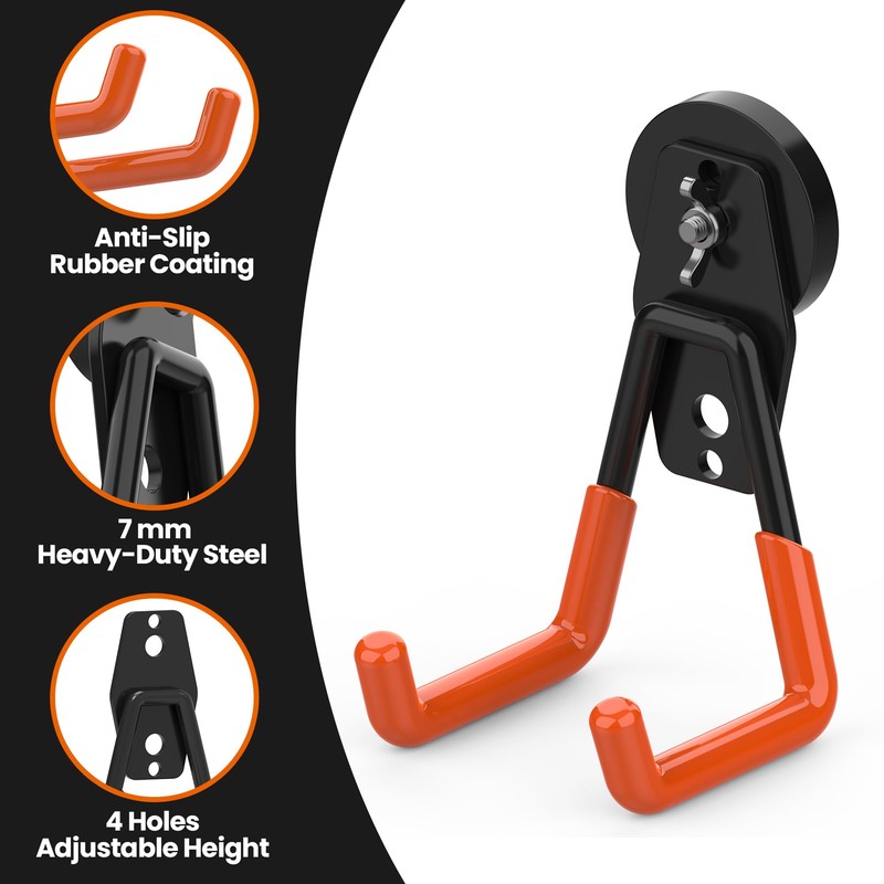 - 【Anti-Slip & Anti-Scratch Coating】 The industrial magnet base and double hooks are covered with durable rubber/PVC coating (high friction coefficient) that enhances grip to prevent slipping, protects surfaces (like metal cabinets, shelves, van, and pegboards) from scratches or marring, and resists rust and corrosion—suitable for both indoor and outdoor use