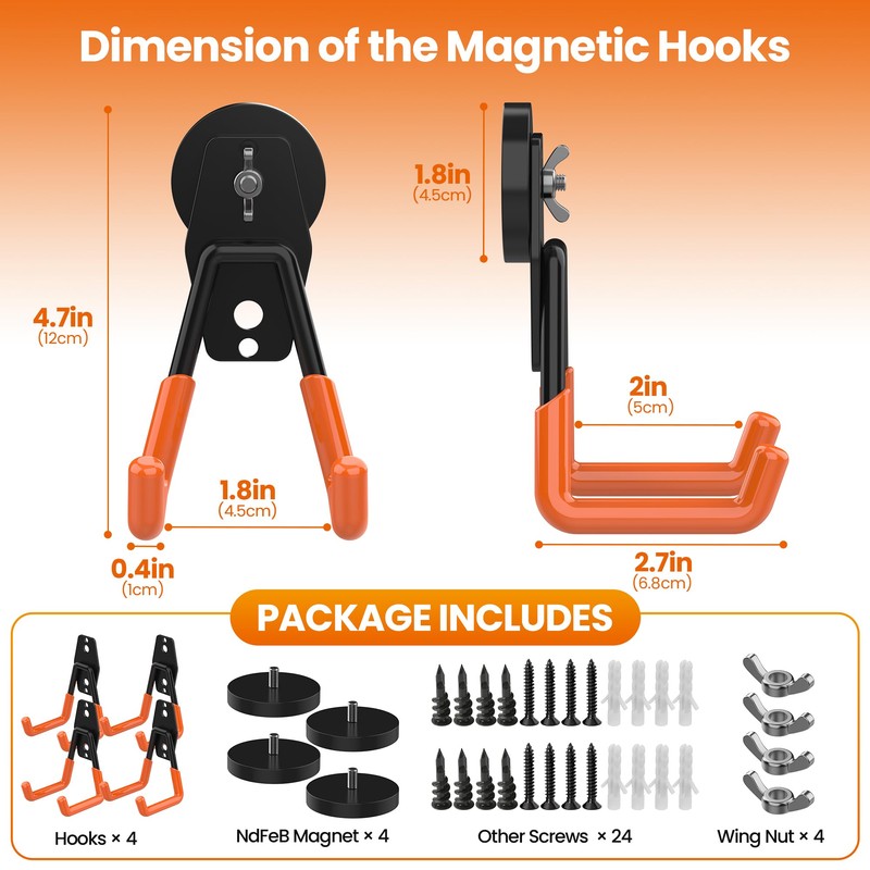 - 【Super Strong Magnetism & Sturdy Structure】 Each magnet hooks heavy duty features magnet base embedded with 6 industrial-grade rare earth neodymium magnets, ensuring powerful adsorption and reliable load-bearing. Made of thick, high-quality steel, these magnetic tool hooks provide a stable hold for heavy tools like power drills, hammer, air tools, shovels, rakes, ladders, toolboxes, toolchests, wrenches, tool carts, as well as daily items such as brooms, mops, dustpans, hoses, gym bags, backpacks, kitchen utensils, dog leashes, wires, straps, ropes, extension cords, clothes, and wreaths